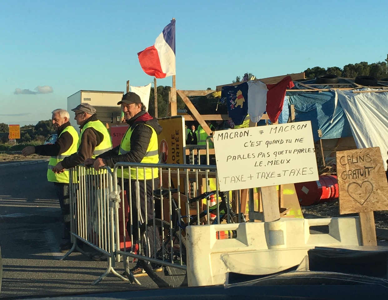 on Veut payer L’ISF On voit une charge à cheval contre des casseurs. Des masques en plastique protègent les yeux des chevaux. Des cagoules noires et des lunettes noires déguisent les jeunes casseurs qui brûlent avec ardeur et montent des barricades que des blindés vert kaki écrasent. Guérilla urbaine. Partout dans les villes de France. Violence meurtrière contre les gestes et les mots d’amitié des Gilets Jaunes entre eux sur tout le territoire. Les Gilets Jaunes prennent leur destin entre des mains fragiles et courageuses. Patrice Rötig m’envoie une photo de rond-point vers Avignon, prise le 10 décembre.